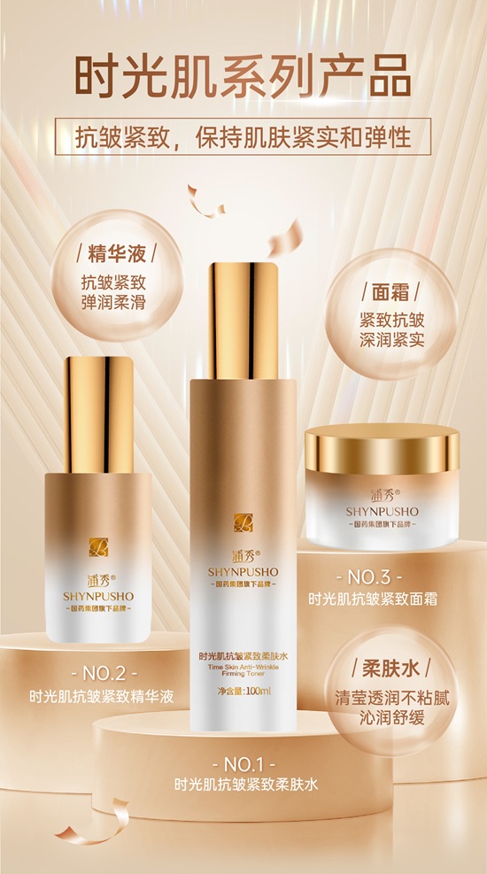 該系列以積雪草提取物、麥角硫因、桃樹酯提取物等為主要宣傳點,抗皺緊致,保持肌膚緊實和彈性,產(chǎn)品包括時光肌抗皺緊致柔水,時光肌抗皺緊致精華液、時光肌抗皺緊致面霜,適用于熟齡肌膚人群。