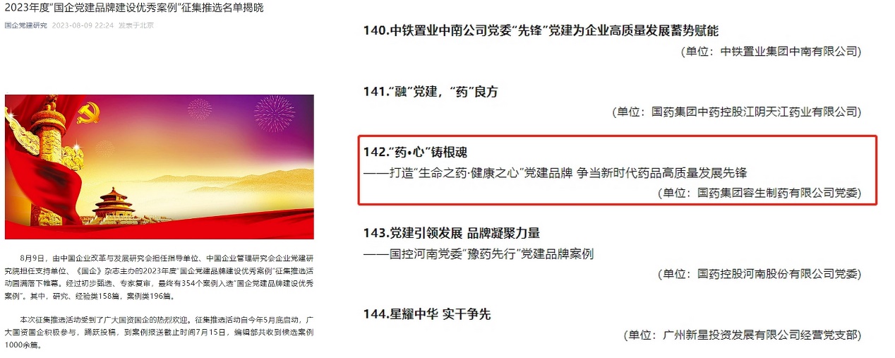 8月9日,由中國企業(yè)改革與發(fā)展研究會擔任指導單位、中國企業(yè)管理研究會企業(yè)黨建研究院擔任支持單位、《國企》雜志主辦的2023年度“國企黨建品牌建設(shè)優(yōu)秀案例”征集推選活動落下帷幕,經(jīng)過案例申報、初步甄選、專家復審,國藥容生黨委《“藥·心”鑄根魂——打造“生命之藥·健康之心”黨建品牌 爭當新時代藥品高質(zhì)量發(fā)展先鋒》從1000余篇案例中脫穎而出,成功入選2023年度“國企黨建品牌建設(shè)優(yōu)秀案例”名單。